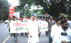 Following the sale of the former public sector company MFIL to the multinational Hindustan Lever, two and a half years ago, the workers have been fighting and continue to struggle. In the course of a long and arduous struggle under the leadership of the Modern Food Industries Employees Union, the workers have been exposing all the falsehoods propagated by the government, the disinvestment minister, and the Lever management to justify the privatization of MFIL. With several forceful examples, they have showed that the disinvestment was completely unjust, that the Lever management had reduced the once – profitable company with an excellent brand name to a loss-making concern. Production has been deliberately reduced there, plant and machinery have been shut down, bread made outside on contract has been labelled and sold as Modern bread, and workers of MFIL have been forcibly given "voluntary" retirement schemes and thrown out of their jobs, so that only about a fourth of the workers now remain. The management has spared no effort in trying to break the unity of the workers, foisting false police cases on the militant union leaders and having them dismissed from service. The valiant and long – drawn struggle of the MFIL workers has forced the government to set up a high – level committee to investigate the effect of disinvestment on the conditions of the workers. In early September 2003, when this committee had a sitting in the Lawrence Road Works, the workers gathered in huge numbers at the gate, denouncing the Lever management and the government and all the falsehoods spread by them. |