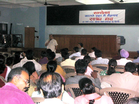 Nikhil De elaborated on the experience of the National Campaign Committee to get an Employment Guarantee Act for rural workers passed. He pointed out that the activists had prepared a draft law for ensuring that all rural workers were covered under an Employment Guarantee Act, and had agitated for its acceptance by the government. The government was forced by the pressure of the mass movement to accept in words that there would be an Employment Guarantee Act. Yet, the experience of the movement was that the government had watered down all the proposals in the draft legislation prepared by activists in the movement, and was instead pushing for an act that guaranteed nothing for anyone, least of all employment. However, the activists were determined to continue the struggle while exposing the government's two-timing activity. He requested all the activists in the cities to frame a draft act covering employment and right to work in the cities, as this would be another pressure point on the government. Lalit Batra spoke about the changing employment pattern in Delhi in the past five decades. He pointed out that Delhi traditionally had a strong concentration of organised sector workers in the form of government and PSU employees, being the seat of the Central and State governments. However, since 1990, the workforce in the organised sector had gone down and the workforce in the unorganised sector had gone up immensely. Unemployment had also increased phenomenally. In 1992, there were 1.96 lakhs unemployed persons in Delhi. By 1999, this number had risen to 5.69 lakhs. Leaders from the DTC Workers Union and the Delhi Electricity Supply Company explained the increased attacks on workers in the organised sector. Comrade Shukla of the DTC Workers Union explained how the company was using contract workers as drivers and conductors in the buses. In an introspective mood, the leader of the electricity workers pointed out that power sector workers had to look into their own shortcomings to see why they were unable to get the sympathy of the people. The leader of the auto-rickshaw workers also explained how they were being fleeced systematically by the authorities, and how there was now a move to eliminate auto rickshaws altogether from the city. In the next session, activists from various branches of the unorganised sector—construction workers, headload workers, street vendors, cycle rickshaw and auto rickshaw drivers, home workers, kabaadi collectors, call centre workers and others — discussed their problems and experiences. These women and men pointed out that there was a need first of all for a law which recognises their work and provides them a modicum of security. Even more, there was need to ensure that such a law would actually be implemented in practice. In the concluding session, a serious discussion was initiated on the necessity, possibility and content of a campaign for ensuring the right to work for urban workers. It was decided that a draft charter would be prepared for such a campaign. Overall, the spirit of the seminar reflected two things — the understanding that the capitalist system was fundamentally anti-people, and that the working people should unite under one banner for the solution of both their immediate and long term problems. |