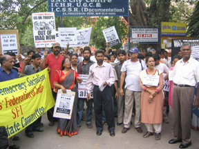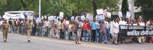 Tony Blair greeted with militant demonstrations in Delhi On September 7, when British Prime Minister Tony Blair arrived in New Delhi, to meet Prime Minister Manmohan Singh with the purpose of advancing the strategic partnership between the Indian government and the European Union, he was greeted with militant demonstrations by the people of the capital. At the call of Lok Raj Sangathan and the Coalition for Nuclear Disarmament and Peace (CNDP), hundreds of activists of numerous mass organisations, human rights organisations, women’s organisations, youth and student organisations, trade unions, journalists and cultural organisations gathered at 11 a.m. at Mandi House Chowk and staged a militant protest march. At the head of the demonstration was a massive black banner bearing the slogan “War criminal Tony Blair, go back!” Holding aloft the banners of all the constituent organisations, the joint demonstration, boldly marched towards the venue of the Blair-Manmohan Singh meeting. The demonstrators carried placards in their hands, on which were inscribed slogans such as “Fascist Blair go back!”, “Assassin of Baghdad go back!”, “Murderer of Basra go back!”, “Down with criminal Blair!”, “Stop racist attacks!”, etc. These slogans were a vivid testimony to the sentiments of the hundreds of people gathered there, towards the fascist and criminal Tony Blair. The streets resounded with slogans such as “Down with the collaboration of the Indian government with the British imperialists!”, “End the illegal occupation of Iraq!”, “Murderer of the Iraqi people get out!”, “Fascist, racist, assassin Blair go back!”, “Down with imperialism!”, “Inquilab Zindabad!”. Hundreds of passers-by stopped to join the demonstrators in denouncing Blair. Prior to the demonstration, all the university campuses and major centres in the city had been plastered with hundreds of posters, calling on all democratic and progressive forces to join in denouncing the visit of Tony Blair. A joint leaflet issued by the participating organisations was also distributed in large numbers all over the city. Declaring Blair to be the closest ally of US imperialism today, a war criminal whose hands are bloody with the murder of thousands of innocents in Iraq, the leaflet roundly criticised the racist and fascist hysteria being spread by the Blair government in Britain in the aftermath of the bombings on July 7. Voicing the sentiments of the Indian working class and people, the leaflet resolutely declared that we will never allow a fascist and racist like Blair to set foot in our country. The demonstration was jointly organised by Lok Raj Sangathan and CNDP. Other organisations participating in the demonstration included AIFTU, People’s Front, PUDR, Saheli, ANHAD, INSAF, Hind Naujawan Ekta Sabha, PSU, DWSC, CITU, AIDWA, SFI, DYFI, DSF, JANAM, AITUC, AIPSO, AISF, AIYF, NFIW, AISA and Forum for democratic initiative. |