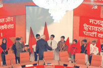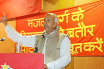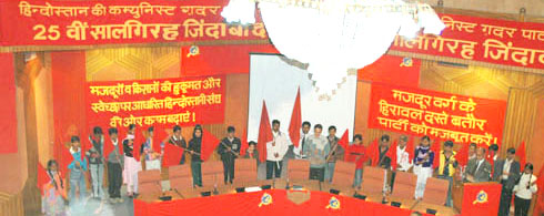 Grand Celebration marks the 25th anniversary of the founding of the Communist Ghadar Party of India. Lok Awaz is proud to announce the successful conclusion of the meeting to celebrate the 25 th anniversary of the founding of the Communist Ghadar Party of India. Comrade Lal Singh, General Secretary of the CGPI, in his keynote address, gave a rousing call to all communists to unite firmly and lead the working class to forge a fighting political front with the peasantry and all the discontented masses of people against the bourgeois offensive. The time is ripe, he pointed out, to build such a front for the democratic renewal of India, thereby beginning the revolutionary transition from capitalism to socialism. As close to five hundred participants arrived from all over the country and abroad, braving the cold and the Delhi fog, they were warmly welcomed by a reception committee. They were then taken to see an exhibition on the history of the party entitled "Safarnama e Ghadar", which vividly depicted the various stages in the life and work of the party. Through the panels of the exhibition, comrades and supporters of the Party relived their past – their persistent struggle to create that force on Indian soil which would lead the workers, peasants, women and youth to victory in the revolution. The celebration began with two columns of young boys and girls marching on to the stage from either side of the auditorium with red flags held proudly aloft, to the accompaniment of the song "Mehnatkash ko Laal Salaam, Mazdooron ko Lal Salaam, Shaheedon ko Lal Salaam, Ghadar Party Lal Salaam" (red salute to the toiling people, red salute to the working class, red salute to our martyrs, red salute to Ghadar Party). The entire audience rose to their feet, clapping their hands to the beat of the song. The hall reverberated with thunderous applause as the spokesperson of the Party welcomed Comrade Lal Singh to the stage, who greeted each of the young red guards with great warmth, demonstrating the love of the Party and its leadership for the youth who are the future of the party and the country. A young woman comrade presented 25 red flags with the Party Symbol to Comrade Lal Singh. The inspiring speech of Comrade Lal Singh was followed by interventions by a large number of comrades, old and young, from different regions of the country and different fronts of work of the party. This was followed by a multimedia presentation on the twenty five years of life and work of the Party. As Comrade Lal Singh gave his concluding remarks, he welcomed to the stage those comrades present in the gathering who had participated in the founding of the Party in 1980. The grand celebrations concluded with all those gathered standing tall with their fists clenched, singing the "The Internationale". |