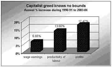 Capitalist growth cannot deliver the working class from exploitation In his budget speech 2006, Finance Minister Chidamabaram, declared that the best antidote to poverty is economic growth. This has been a favourite claim of the Indian ruling class that capitalist economic growth will automatically get translated into better quality of life and well-being of the people. According to the Finance Minister, this means that the working class should wait for faster capitalist economic growth to deliver it from poverty and exploitation. In the capitalist system, the capitalists aim at maximizing their profits. They do this by appropriating as much of the surplus value created by labour as is possible under the given conditions. As capitalism advances, more and more technology and advanced machines are used in production, thus raising the productive capacity of labour. But this increase in productive capacity of labour does not benefit the working class directly. A large portion of this additional value created by labour due to increased productivity is again appropriated by the capitalist. What the working class finally gets is a few crumbs from capitalist growth. This fact has been clearly brought out by data published by the Annual Survey of Industries (ASI). This survey covers factories registered under the Factories Act. The 2003-04 survey covered all factories employing 100 or more workers and all factories in 5 industrially backward States/UTs, namely, Manipur, Meghalaya, Nagaland, Tripura and A&N Islands, irrespective of size. From the remaining factories, a sample was taken. The survey shows that between the period 1990-91 and 2003-04, the years of capitalist reforms, economic growth was made possible by increasing labour productivity, but the fruits of this growth was appropriated by the capitalists. In these years, the number of factories covered by the survey marginally increased from 1.1 lakh units to 1.29 lakh units. The number of workers employed in these factories actually decreased from 63 lakhs to 60.8 lakhs. However, the total output of these factories increased from Rs 2,70,564 crores to Rs 12, 87, 400 crores. During this period of 13 years, labour productivity increased at a much faster rate than wages. While productivity increased by an annual compound rate of 13.6%, wages increased only by 6.65%. This increase hardly compensated the worker for inflation. During the same period, the profits of the capitalists increased even more faster, at the compound rate of 17.5%. So, in these years when the capitalists infused better technology and machines and brought about an increase in productivity, and hence an increase in net value added by labour, the worker remained as impoverished as he was earlier. The working class should refute the claim of Indian capitalists and their conciliators within the working class movement that stepping up capitalist economic growth is the solution to eradicate poverty. As long as the working class is deprived of political power it cannot ensure that the fruits of economic growth benefit the vast majority of people. Only by establishing the rule of the working class and peasantry can the working people ensure that the Indian economy is oriented to serve their interests and that the surplus created in the economy is actually deployed to raise the quality of life of the working people. |