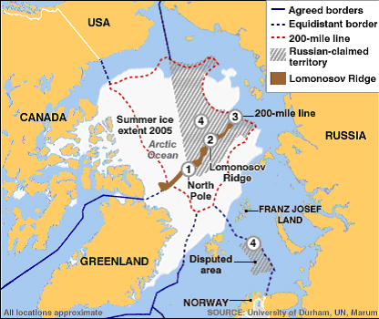 Territorial disputes in the Arctic region are neither few nor new. However, there is a frenzy of activity to buttress the claims of each of the countries involved especially since it is now estimated that up to 25 per cent of the world's undiscovered energy resources lie in Arctic areas. Moreover, global warming is believed to be the cause of melting of parts of the polar ice cap. This in turn is allowing for easier exploration in the forbidding icy wastes of the Arctic regions. If the ice retreats, it could open up new shipping routes and new areas where natural resources could be exploited. The North Pole is not currently regarded as part of any single country's territory and is therefore administered by the International Seabed Authority based in Jamaica.