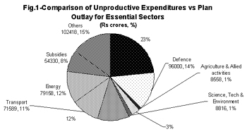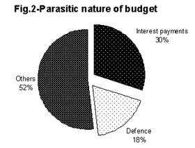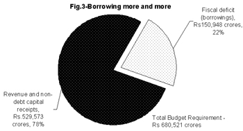 The Budget for 2007-08 continues the tradition of past years as far as the parasitic nature of central government finances is concerned. Out of the total revenues collected and retained by the central government in 2007-08, including all taxes and fees and non-debt capital receipts, 48% will be consumed by interest payments and defence expenditure (See Fig.2). If principal loan repayments are also included, almost the entire revenue will be eaten up by these unproductive outflows. All other spending has to be financed by additional borrowing, which is estimated at about Rs. 150,000 crore in 2007-08 (See Fig.3).