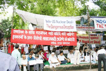 Speakers from Lok Raj Sangathan and other organisations explained that the Indo-US nuclear deal is part of the larger Indo-US strategic alliance, including the Defence Framework Agreement of June 2005, which aims to tie up India militarily with the strategic imperialist interests of US in Asia and globally. With this alliance, there is going to be increasing pressure on the Indian government to align with US policy, or suffer various consequences. The big corporate houses in our country are very excited about the alliance as they see it as a means to advance their own imperialist aspirations. But our toiling masses have nothing to gain from such an imperialist alliance, directed against our friendly relations with other countries and against peace in this region.