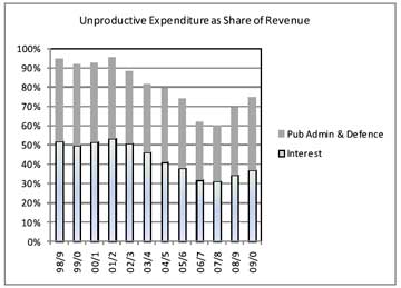 The net additional borrowing by the central government is projected to be as large as Rs. 4 lakh crore during 2009/10. This is determined by the ‘fiscal deficit’ – the gap between revenue and total expenditure, which has to be financed by borrowing. This will raise the total outstanding debt of the central government to about Rs. 34 lakh crore by March 31, 2010 – roughly Rs. 29,000 per person in the country. Adding the debt of state governments will raise this close to Rs. 50,000 per person. The share of central government revenue consumed by interest payments is projected to rise to 37% in 2009/10, from 31% in 2007/08.