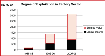 Official data show that the annual value created by the toil of workers in registered manufacturing industry rose from Rs. 22,600 crore in 1985/86 to Rs. 311,900 crore in 2005/06. The portion pocketed by the owners of capital in the form of profits, interest and rent (together called surplus value), rose much faster than what was paid to the workers as wages and salaries (called labour income).